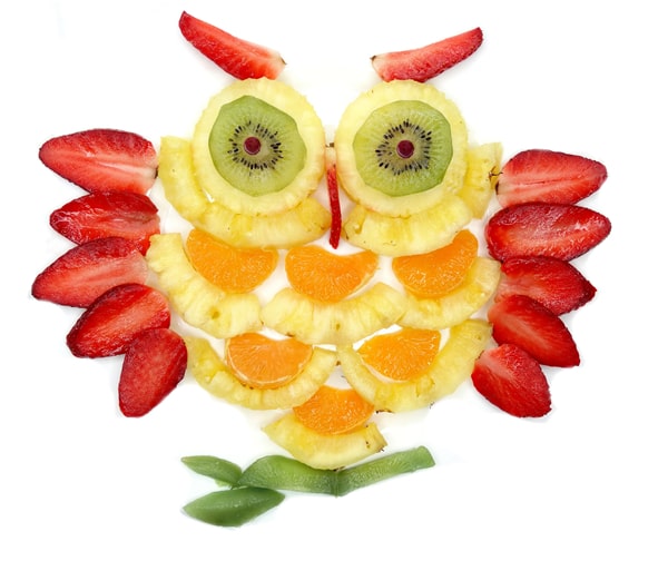 制作方法:將水果切片,尤其草莓、橙子、菠蘿都要切得有型。要記得留下一半草莓來(lái)作為貓頭鷹的眉毛和鼻子哦。