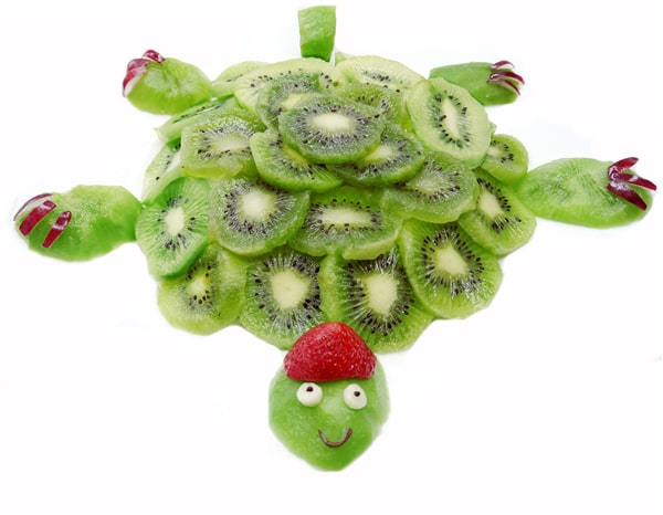 2、再取3個(gè)獼猴桃,2個(gè)對(duì)半切成作為海龜?shù)膬墒謨赡_,另外一個(gè)獼猴桃按照4:1的樣子切出來(lái),作為海龜?shù)念^和尾巴。