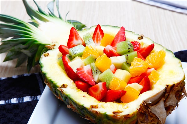 4、將事先切好的水果放入這個(gè)菠蘿器皿中就好啦!