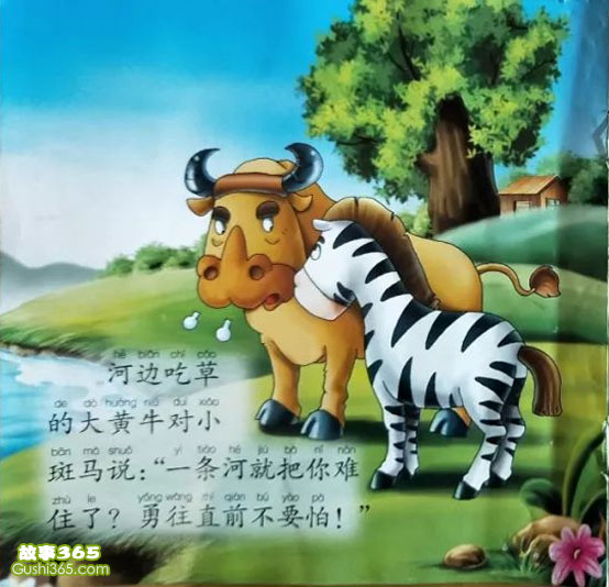 大黃牛對(duì)小斑馬說(shuō):“這條河不深,才到我的膝蓋,你能淌過(guò)去的。一條小河就把你難住了?勇往直前不要怕!”