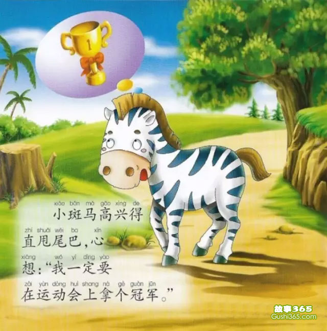小斑馬一看來(lái)信,高興得直甩尾吧,心想:我一定要在運(yùn)動(dòng)會(huì)上拿個(gè)冠軍。想著想著,小斑馬似乎已經(jīng)看到了自己站在領(lǐng)獎(jiǎng)臺(tái)上,捧著金色獎(jiǎng)杯的樣子。