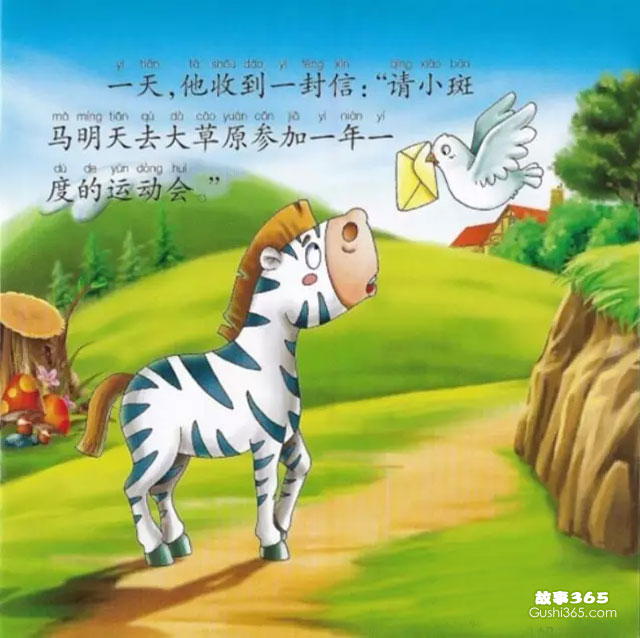有一天,小鴿子飛到樹(shù)林里來(lái),給小斑馬送來(lái)一封信,信上寫著: