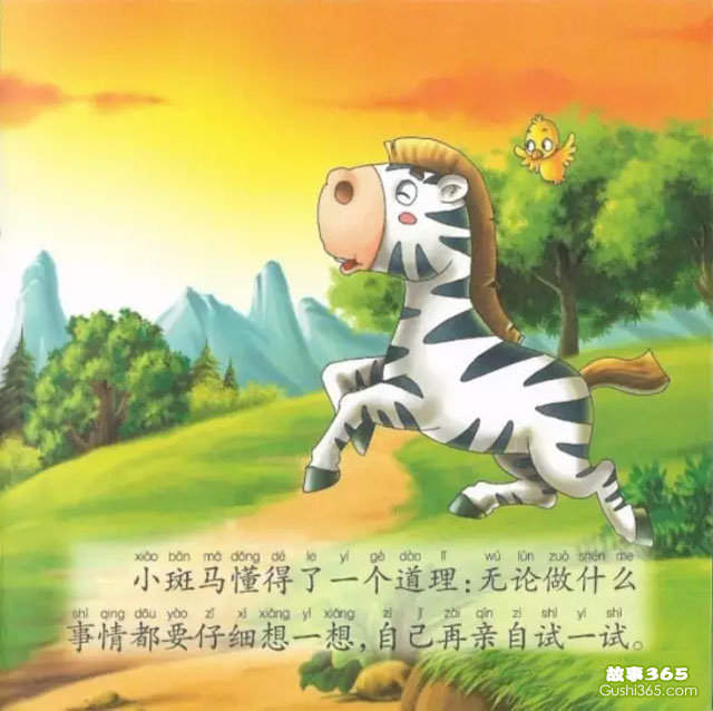 小斑馬過(guò)了這條小河之后,搖搖脖子,甩甩尾巴,灑出許多小水珠來(lái)。他懂得了一個(gè)道理:無(wú)論做什么事情,都要仔細(xì)想一想,再親自試一試才知道。