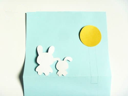 為了讓賀卡更加精致,所以我們要確定好位置之后再繼續(xù)下一步,將彩紙展開,把之前剪好的兔子和月亮放在賀卡上,確定好擺放的位置,并用鉛筆標記定位。