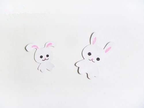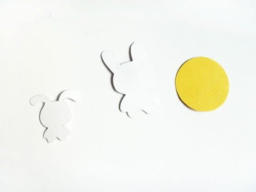 選擇一張白色和黃色卡紙,在白色卡紙上畫出自己喜歡的兔子圖案,最好一大一小,在黃色卡紙上畫出一個圓形,然后將它們剪下來,放在一邊備用。