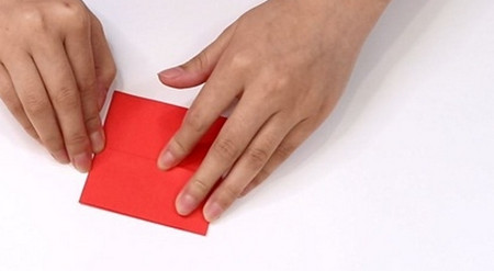 2、取半張,對(duì)折,將一邊對(duì)齊折痕對(duì)折。