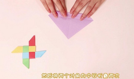 1、第一步:首先準備四張方形彩紙。取一張沿斜角對折。