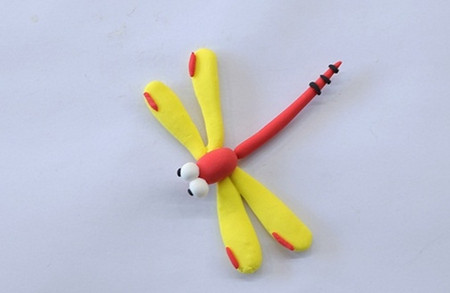 最后用白色與黑色橡皮泥做出它的眼睛,并將眼睛粘在頭部位置,一只蜻蜓就做出來啦。