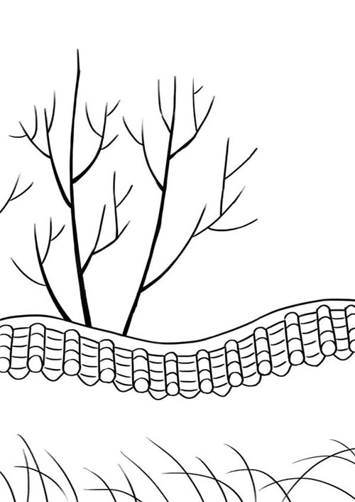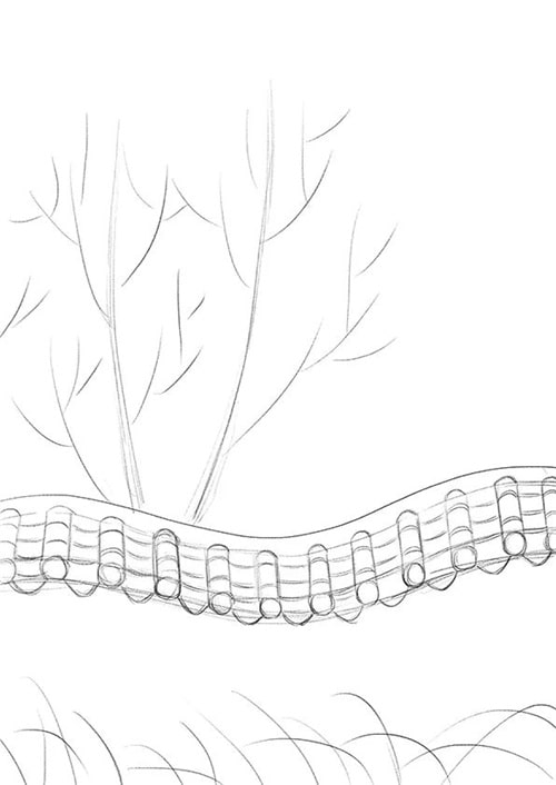 2.繼續(xù)用鉛筆完善矮墻的細節(jié),并畫出美人梅的枝干和迎春花的莖。