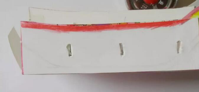 將紙盒剪成船的形狀,中間有點(diǎn)凹陷,然后在紙盒邊上打上船漿的孔。