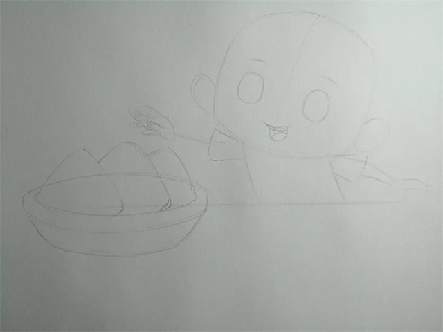 2.在上一步的基礎上,繼續(xù)畫出粽子的基本型和人物的五官位置和基本動態(tài)。