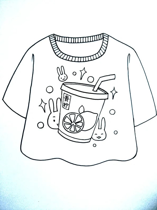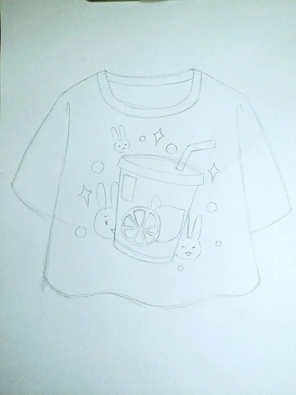 1、首先我們用鉛筆在素描紙上勾勒出T恤的輪廓以及衣服上的圖案。
