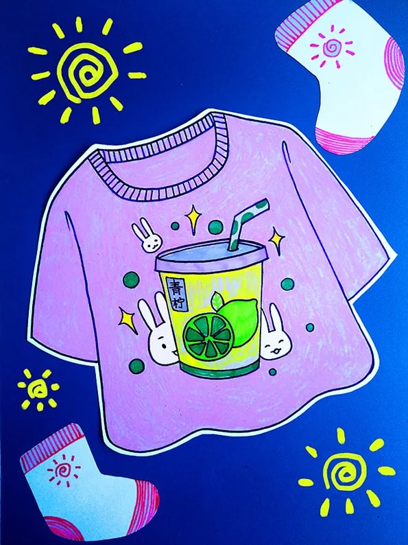 4、最后我們將畫好的T恤剪下粘貼到藍(lán)色硬卡紙上,并裝飾襪子和太陽(yáng)圖案,至此整幅作品完成。今天的課程分享就到這里,希望對(duì)您有所啟發(fā)。