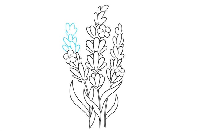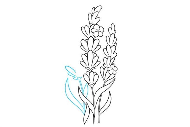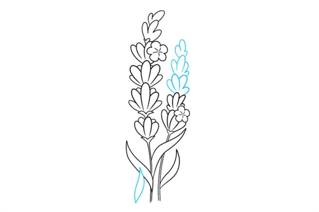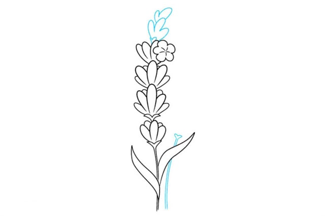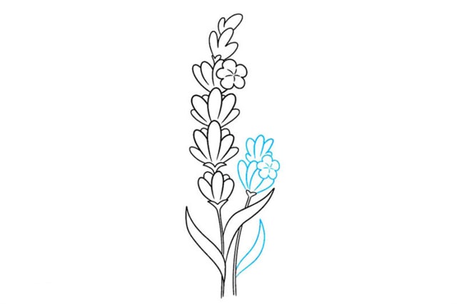 2、在第一個上方繪制另一片葉子,從莖上延伸兩條曲線,使其在某個點(diǎn)相遇。在花朵上方繪制“ V”形的線條,其尖端到第一朵花的頂部形成曲線。薰衣草植物在同一莖上有很多花。在“ V”上方,使用“ U”形線形成第二朵花的花瓣。然后,開始畫下一朵花的“ U”形花瓣。