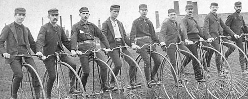 自行車發(fā)明的早期階段,人們認為越大的輪子行駛的速度越快,兩名男子騎著一輛車輪幾乎為一人高的自行車。