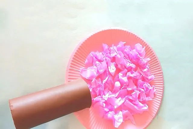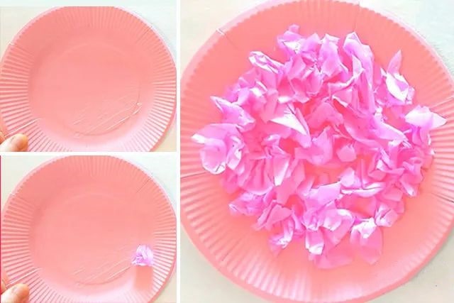 2、在粉色紙盤內,涂抹膠水,再把粉紅色小紙團粘貼在紙盤表面,直到紙盤中間部分(紙盤外圈帶紋理的部分不必粘貼)被小紙團覆蓋。