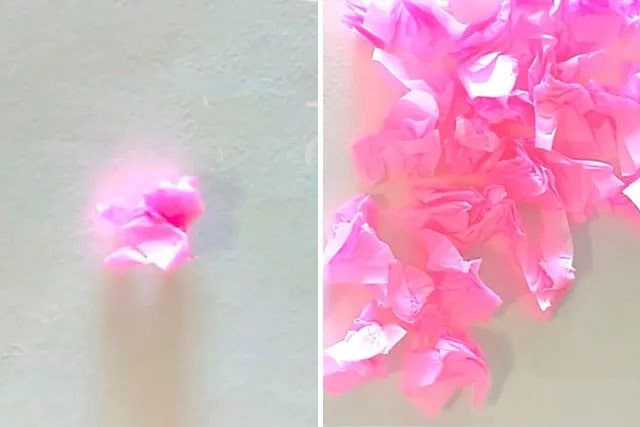 1、把粉紅色手工紙剪成小塊,再用手揉成小團狀。用同樣的方法準備足夠多的粉紅色小紙團。