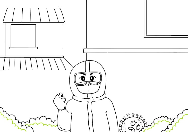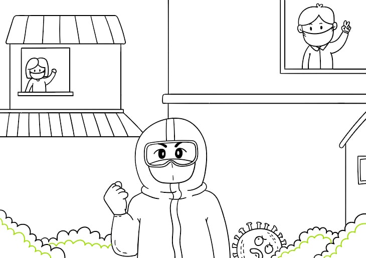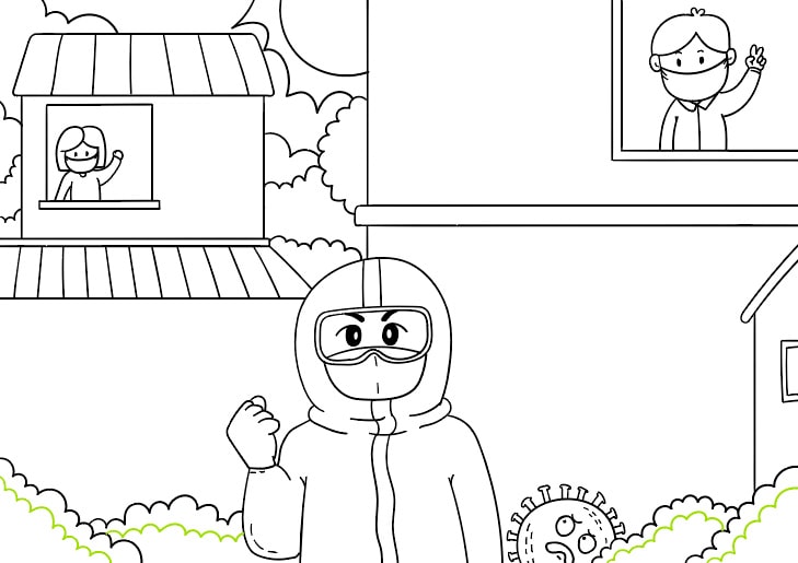 首先畫醫(yī)護人員的臉部。畫出醫(yī)護人員的身體,注意這里的醫(yī)護人員穿著防護服。左右畫一些草叢修飾,再畫一個害怕表情的病毒。在身后畫一些房子。房子窗口位置畫兩個人戴著口罩。完善一下背景的細節(jié)。最后涂上漂亮的顏色,疫情防控靠大家手抄報圖片就畫好了。