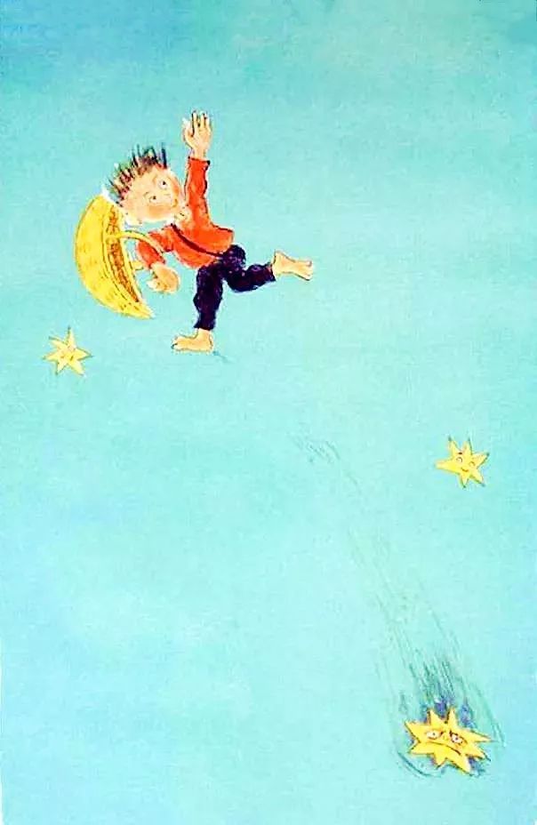 月光男孩為了給月亮尋找另外一個月亮,拎著籃子出發(fā)了。他落啊落啊,從天上落了下來,先是穿云而過,然后是飛機、一大群候鳥、風箏、氣球、站在梯子上采蘋果的小女孩、打掃煙囪的黑臉男人、紅磚房、街道,最后“撲通”一聲落到了水里…