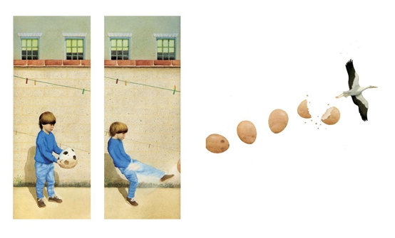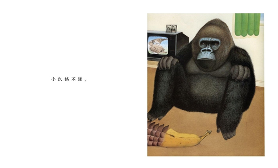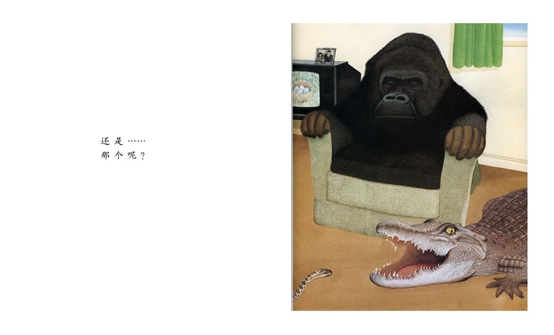 (小凱不明白這些變化是不是爸爸說的變化,而此時單人沙發(fā)完全變成了黑猩猩,鱷魚的尾巴竟然變成了香蕉。再看電視畫面,那些鳥蛋已經(jīng)孵化成小鳥了,大鳥在給他們喂食。后面的綠色窗簾變成了手指頭。)