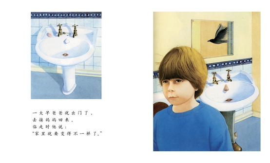 (開頭的那些變化有原因了,都是因為爸爸的話。而小凱又發(fā)現(xiàn)不一樣的地方了,左邊圖中洗手池的水龍頭像兩只眼睛,有一塊水漬像個鼻子,而下水道口儼然就是一張嘴。到了右圖,鼻子更明顯了,嘴沒有變化,下水道的支撐柱變成了爸爸穿西裝褲的腿和穿著皮鞋的腳,在鏡子中有只黑鳥飛過,那只貓藏在爸爸的腿后面。小凱的表情似乎若有所思,好像在想,爸爸說的變化到底是什么呢?)