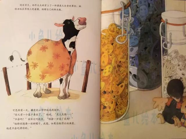 最難做的衣服是奶牛太太的。“我想要一件漂亮的長衫,還要閃閃發(fā)光的大紐扣。”奶牛太太說。