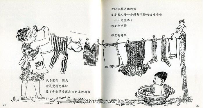 為《我喜歡你》繪制插畫的是曾獲《紐約時(shí)報(bào)書評(píng)》年度最佳插畫讀物獎(jiǎng)的杰奎琳·瓦斯特。黑白插圖風(fēng)格獨(dú)特,就像報(bào)紙上略顯夸張的鋼筆漫畫,不漂亮卻可愛(ài),富有日常生活氣息又帶著上世紀(jì)60年代微微古典的感覺(jué)。
